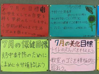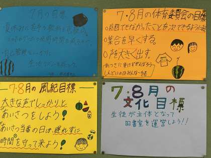 正門入って右側の掲示板に生徒会や専門委員会の7月の目標が掲示されています。それぞれの委員会の目標は知っていますか?