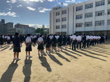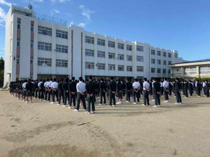 本日より月曜日の全校集会を放送からグラウンドに変更して行いました。表彰や服装の話などを行いました。