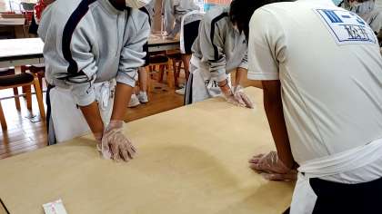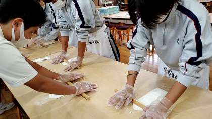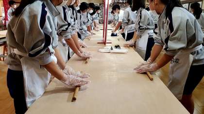 クラス毎に分かれてうどん作りとこんぴら散策に行っています。