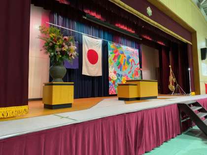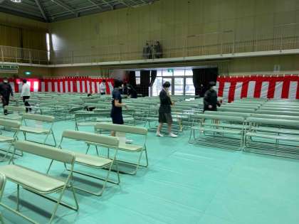 午後から2年生が会場準備を1年生が会場周辺清掃を行いました。最後はバレー部の協力のもと微調整を行なっていました。