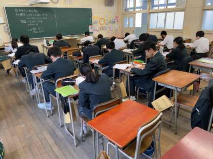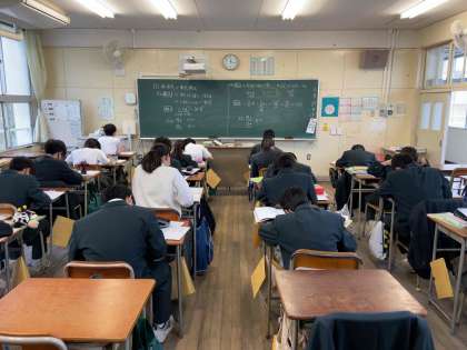 2年生の数学の授業の様子です。1つのクラスを分割し、教室とパソコン室に別れて、20人ごとで授業を行なっています。皆、集中して計算していました。