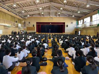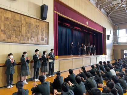 本日の全校集会の様子です。生徒会のメンバーが司会を行い、運営しています。学校を代表して生徒会のメンバーが頑張っています。