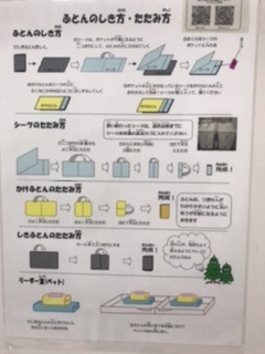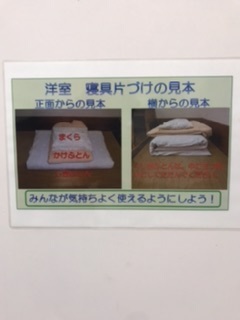 生徒自身が決められたふとんのしき方、シーツの折り方をし就寝準備をしました。