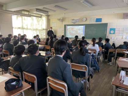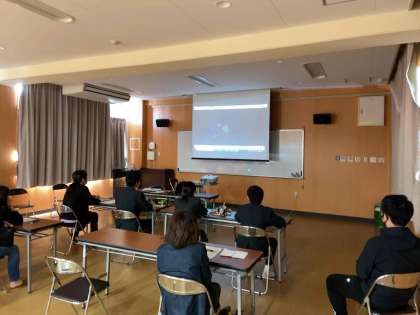 コロナ禍ということで、多目的室からオンラインで各クラスに配信し、映像視聴やパワーポイントを活用した説明を聞きました。