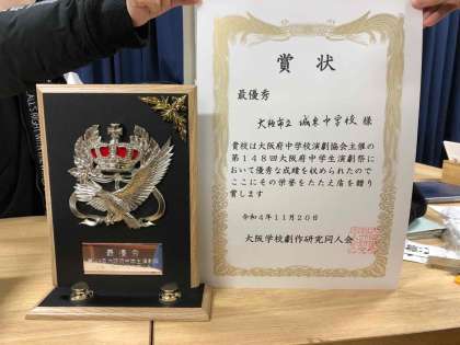 演劇部が11月19日(土)に行われた大阪府秋の演劇祭で、最優秀賞を獲得しました。日々の練習からそれぞれが一生懸命演技し、本番でも緊張しながら披露することができた結果でした。