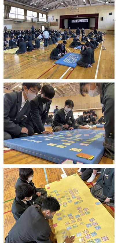 2月17日(金)に2年生は百人一首大会を行いました。昨年は実施できなかった分、生徒たちも一生懸命取り組み、上の句で札をとる生徒がたくさんいました。特に皆が覚えている「む・す・め・ふ・さ・ほ・せ」や「ちはやふる」、「うかりける」などは下の句を詠んでいる声がかき消されるほど、喜び声や悔しそうな声が聞こえてきました。