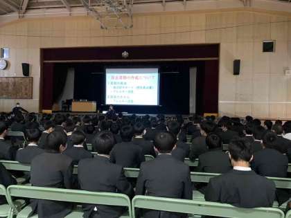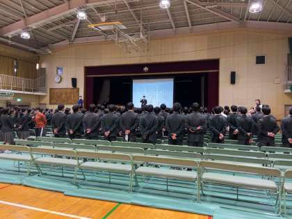 体育館は3年生が卒業式の練習しているので、普段とは違った雰囲気、来年の今頃はどんな姿になっているのかを話の最初に行い、集会がスタート。