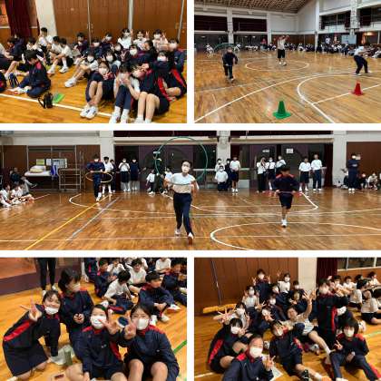 室内レクリエーション、最終競技フラフープリレーの様子と、生徒の様子です。