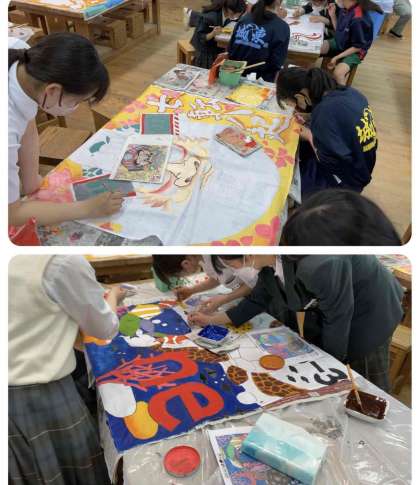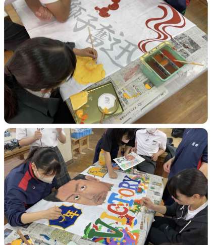 中間テストが終わり、放課後には体育大会の学級旗の作成がはじまりました。3年生の様子です。
