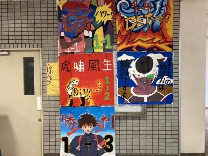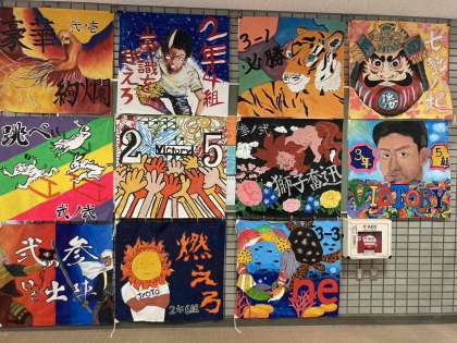 現在、正門のピロティには体育大会で各学級が使用する学級旗が飾られています。どのクラスも工夫を凝らした作品になっています。体育大会当日は入場行進で使用し、その後掲示する予定です。