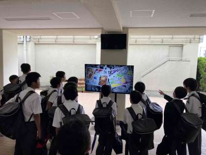 また、美術科の先生が作成過程を動画で映像化して、モニターで流してくれています。生徒たちも興味津々に見ています。
