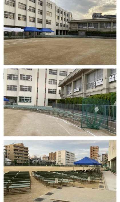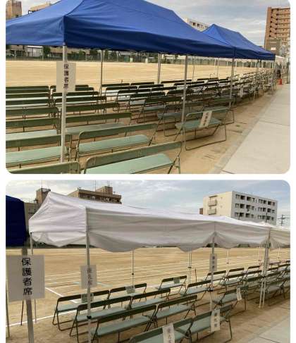 8時30分西門を開門します。保護者の皆様は徒歩、自転車ともに西門からお入りください。保護者席は写真のように用意させていただきました。譲りあって利用お願いします。一部優先席も設けています。