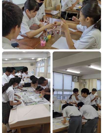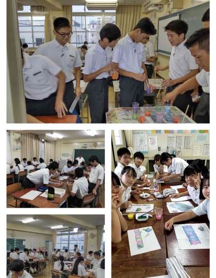 今週より文化祭の取り組みが各学年で始まりました。3年生は灯籠制作に挑戦しています。半紙を折り、いろいろな色で折り染を行いました。たくさんのカラフルな作品ができそうです。