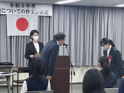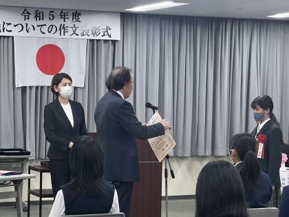 12月15日(金)城東税務署において、「令和5年度税についての作文表彰式」がありました。作文は、2200作以上の応募の中から選ばれ、本校からは3年生の谷山彩羽さんと森彩葉さんが「城東納税貯蓄組合連合会優秀賞」を受賞しました。