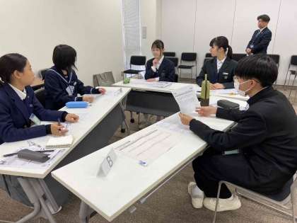 城東区内の6校の生徒会役員が集まり、いじめに関するグループディスカッションや事前研究を行いました。SNSでのトラブルを事例に、各班で積極的な意見交換がありました。