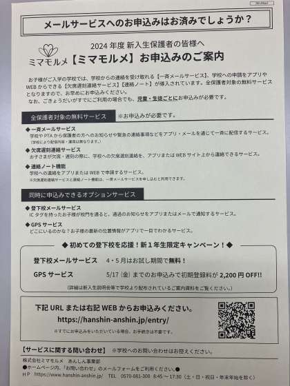 欠席遅刻等アプリ「ミマモルメ」に登録をお願いします。