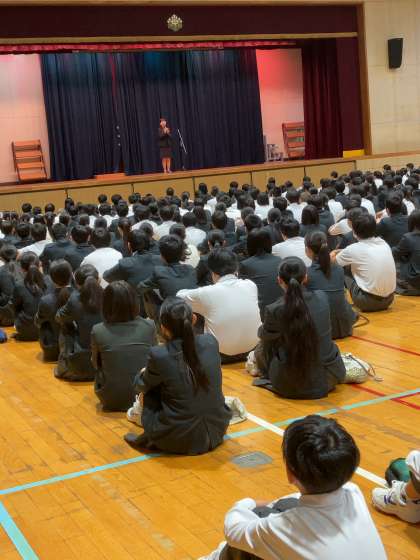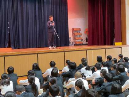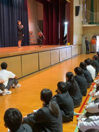 全校集会で、校長先生と生徒指導主事の先生から、いじめはいけないこと、いのちの尊さなどについてお話をしました。