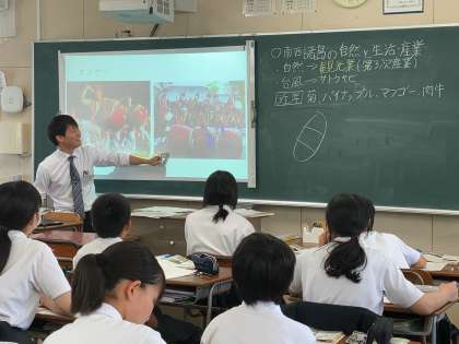 3限目、2年2組は社会科の授業でした。地理分野の「九州地方」を学習していました。