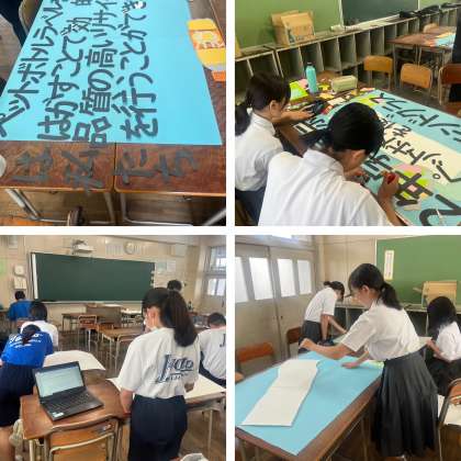 クラスの文化祭係の1回目の取り組みを行いました。文化祭の展示に使う看板や、プラスチックのリサイクルに関するポスターを作りました。