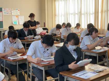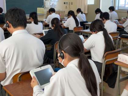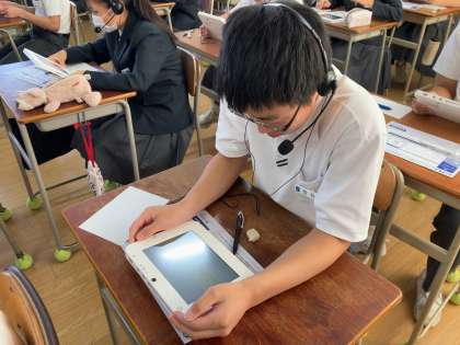 リーティング・リスニング・ライティング・スピーキングのテストを行いました。タブレット端末やヘッドホン、イヤホンマイクを使用し、いつもと違うテスト方法に生徒たちは戸惑いながらも、落ち着いて受けていました。