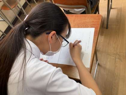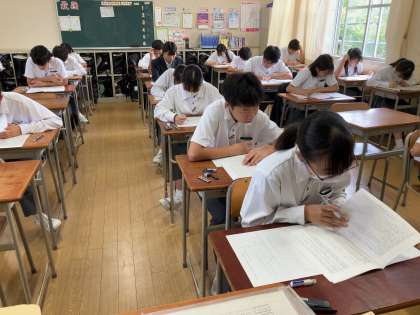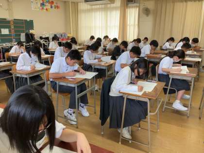英語・理科・社会・国語・数学の順でテストを受けています。高校進学に関わる重要なテストです。皆真剣に取り組んでいます。