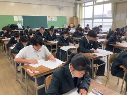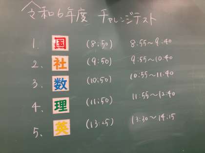 2年生は、大阪府チャレンジテストです。チャレンジテストは、府内における中学生の学力を把握・分析する目的に加えて、高校入試で点数となる内申点について、中学校ごとのばらつきを無くし公平性を担保する資料を作成する目的のもと実施するものです。