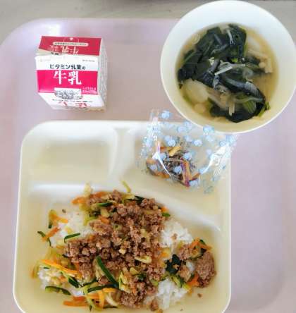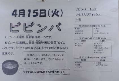 ビビンバ(ごはん) トック いもケンピフィッシュ 牛乳 です