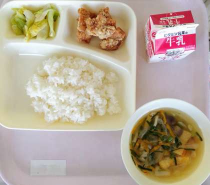 今日のメニューも生徒に人気の鶏のから揚げですね。1年生の皆さんもきっと給食を楽しみにしてくれるかな。