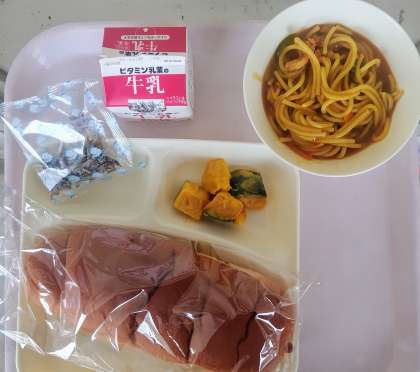 カレースープ・スパゲッテイ かぼちゃのマリネ焼き 黒糖パン