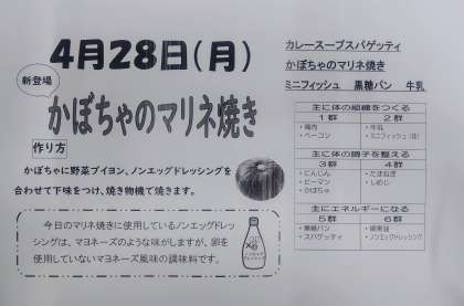 今日の給食のかぼちゃのマリネ焼きにはノンエッグドレッシングが使われています。卵を使わずに作られたドレッシングです。マヨネーズタイプの調味料としても知られています。卵の代わりに、大豆由来の原料や植物性素材などを使用し、マヨネーズのこくや風味を再現しています。卵アレルギーの人でも安心ですね。