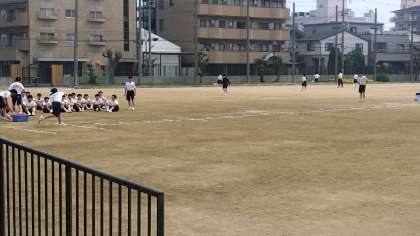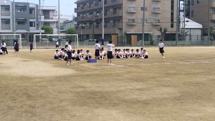 今日は1・2年生にハンドボール投げの測定を行いました。まず直径2mの円内から投球し、ボールが落下した地点までの距離を計測します。あらかじめ1m間隔で円弧が描かれているのです。その円弧で距離を測りメートル単位で記録します。2回試行して、より良い記録を採用しました。