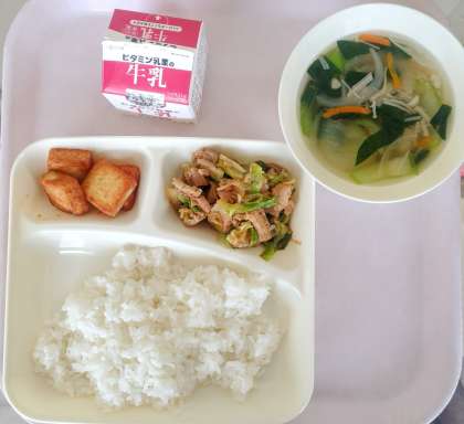 ホイコーロー  中華スープ  厚揚げのピリ辛じょうゆかけ
