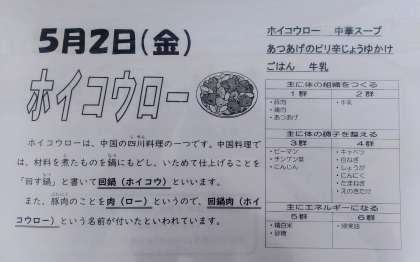 今日はホイコーローですね。漢字で書くと「回鍋肉」と書き、四川料理の一つです。回鍋とは鍋を回すことではなく、一度調理した食材を再び鍋に戻して調理することだそうです。