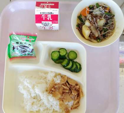 肉じゃが きゅうりの酢の物 ごまかかいため(たけのこ料理)