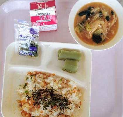かやくご飯 きざみのり みそ汁 ごはん 抹茶ういろう 牛乳です