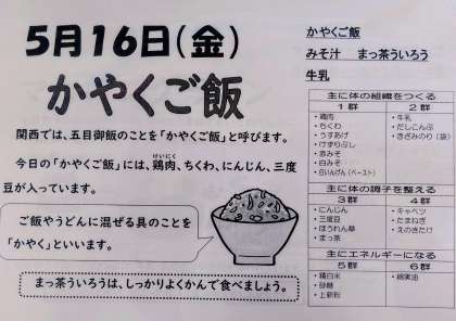 今日のメニューのかやくご飯は、関東地方では一般的に五目ご飯と呼ばれているそうです。どちらも炊き込みご飯を指し、かやくは漢字では「加薬」と書きます。かやくご飯は冷めても美味しいこと、具材が豊富で栄養バランスが良く、冷蔵庫に眠っている野菜などを利用できるなどいろんなメリットがありますね。