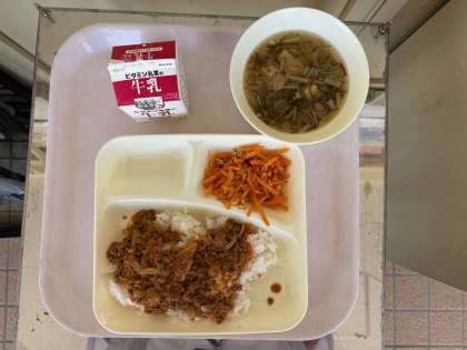 本日のメニューは、タコライス、牛乳、とうふともずくのとろり汁、にんじんのしりしり風、でした。
