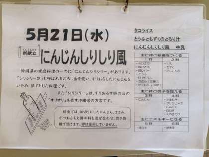 今日は沖縄風のメニューでした。「にんじんしりしり風」は新メニューでしたが、気に入ってもらえたでしょうか。
