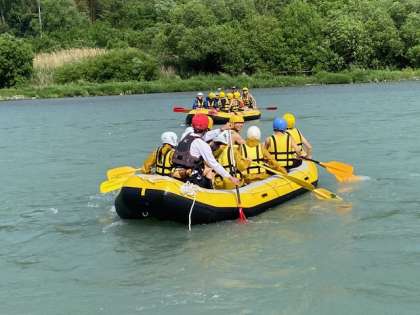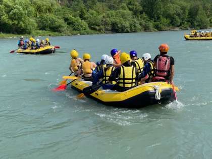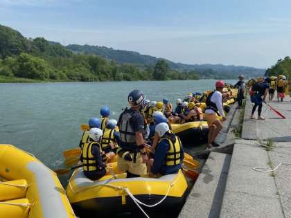 ラフティングスタート地点に到着しました。ライフジャケットとヘルメットを身につけ、パドルをしっかり握って、さあ、出発です。