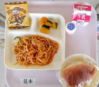 ミートソーススパゲッティ  焼きかぼちゃ  カレーフィッシュ