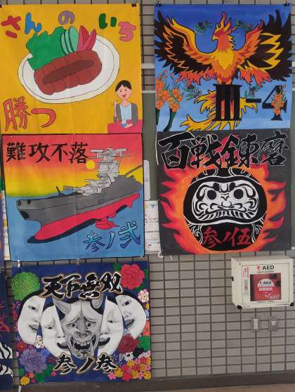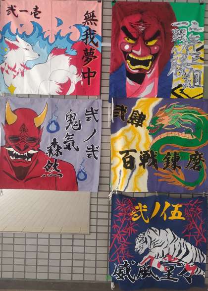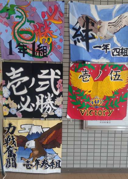 各学年の力作をご紹介します。明日の体育大会ではこの学級旗のもとクラス全員が団結して各種競技を競います。
