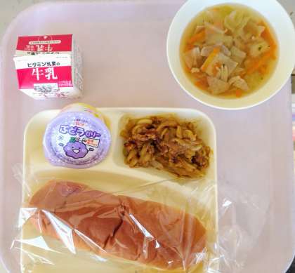 カレーマカロニグラタン てぼ豆のスープ ぶどうゼリー