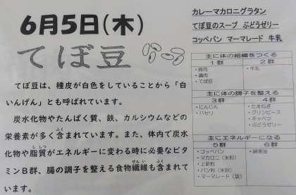 今日の給食の「てぼ豆」って何でしょう。てぼ豆は「手芒(亡)豆」と書き、種皮の色の白い、白いんげん豆の一種だそうです。白あんの原材料として実用されており主産地は北海道で、名前の由来は「蔓(つる)=手」が無い(亡)ということだそうです。