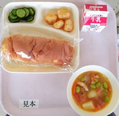 きゅうりのバジル風味サラダ パン 牛乳 です