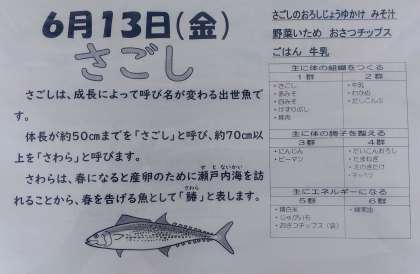 今日は和食メニューですね。メインのお料理はサゴシです。この魚はサワラの幼魚ですが、幼魚といっても体長は40cm〜50cmにもなります。サワラは成長するにつてて【サゴシ】→【やなぎ】→【サワラ】と呼び名が変わるいわゆる出世魚です。