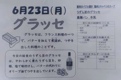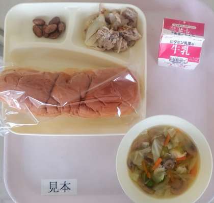 豚肉のバジル焼き 鶏肉とキャベツのスープ うずら豆のグラッセ