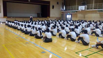 「もうすぐ楽しい夏休みが来ますね。でも中学校最後の夏休みでもあり、そしてこれまでの学生生活を思い返してみて、楽しかった思い出だけでなく、困ったときに友に助けられたことへの感謝の気持ちを伝えることができたか、決められたことを守れたかなどを振り返るための時間も持ってほしい。また、これからの進路をしっかり考える時間でもあります。2学期になると進路について相談したりアドバイスをいただく機会がたくさんあります。しっかり夏休み中に自分の進路について考えてみましょう。」