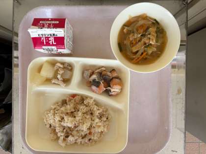 「焼き魚」のイメージとは異なる、サイコロ状のさけです。近頃の学校給食では、骨のある魚はほとんど出ません。以前より残食も少なくなっています。