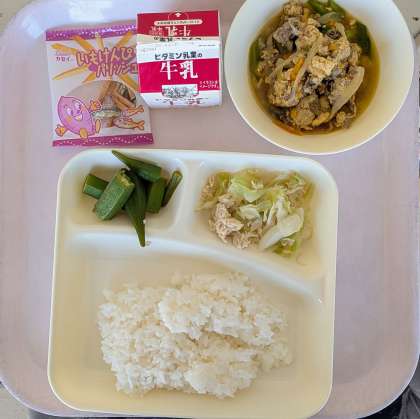 今日は旬の夏野菜オクラがメニューにありますね。オクラには断面が星形の「五角オクラ」と、丸い断面が特徴の「丸オクラ」(別名 島オクラ)があります。最近は丸オクラが実も柔らかく人気があるので店頭でもたくさん出ています。オクラには食物繊維が豊富で、整腸作用、コレステロール、血糖値の上昇抑制に役立つとされています。また骨を丈夫にするカルシウムも豊富でとても重宝な野菜です。残さずしっかり食べましょう。