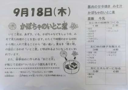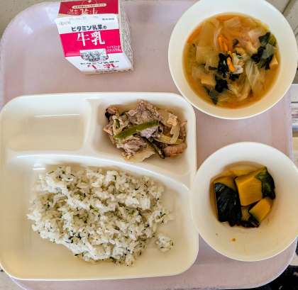 今日のごはんは菜飯(なめし)ですね。刻んだ青菜を入れるだけ、ほんの少しの塩味。青菜の素朴な風味と食感がシンプルですが食欲をそそります。かぼちゃとあずきのいとこ煮もお腹にやさしいメニューですね。文化祭の準備で大忙しですが、しっかり昼食を食べて制作や合唱の練習に励みましょう。